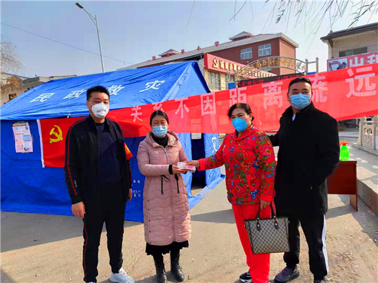 防疫物資緊缺是開展防疫工作面臨的共同難題。王七峰在防疫工作開始后,第一時間向城南辦事處捐助資金5萬元,并發(fā)動親屬積極捐款,其三哥王永紅捐助資金2萬元支持城南辦事處疫情防控工作,14歲的侄子王璽博也將自己的5000元壓歲錢捐了出來,為抗擊疫情助力。之后,王七峰除了統(tǒng)籌村里的防疫工作外,每天早上6點(diǎn),還會準(zhǔn)時到村里各個防控點(diǎn)或巡查或值守,始終堅(jiān)守在排查登記、區(qū)域防控第一線。有了王七峰的帶頭表率,該村的干部、黨員、志愿者紛紛加入抗疫隊(duì)伍中來,村民們也是有錢出錢、有力出力,大家眾志成城,有效落實(shí)了聯(lián)防聯(lián)控、群防群治的各項(xiàng)措施。