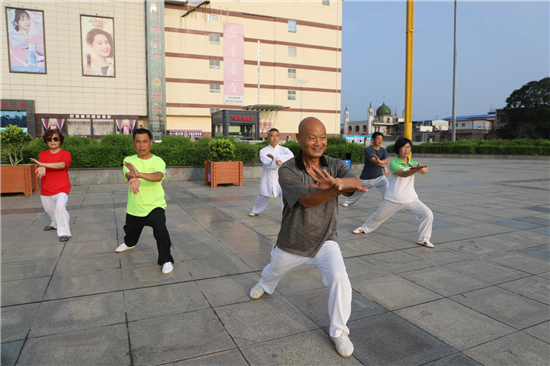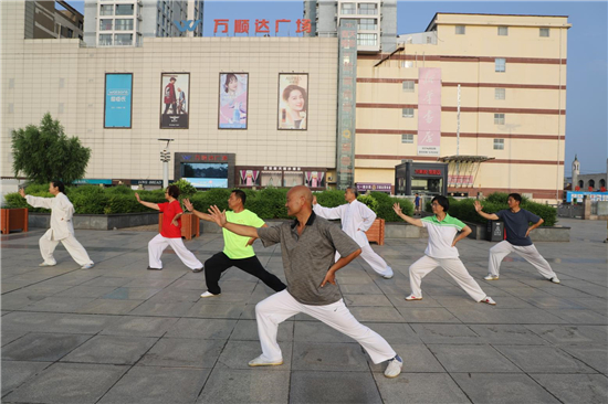 冬練三九,夏練三伏,練出一身真功夫。投伏第一天,周口市武術(shù)協(xié)會(huì)會(huì)長(zhǎng)張志民帶領(lǐng)會(huì)員在五一文化廣場(chǎng)習(xí)練新編和氏26式太極拳。記者 王凱 攝