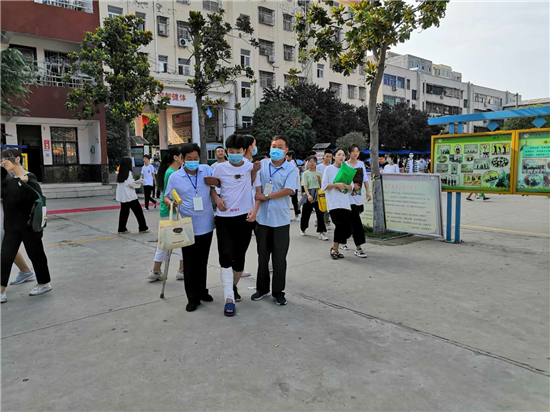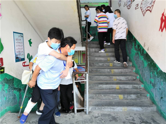 “終于到了,要不是身體好,還真不能一口氣把這孩子背上三樓。”鄲城縣第三實驗中學考務(wù)老師張子江邊擦汗邊笑著說。