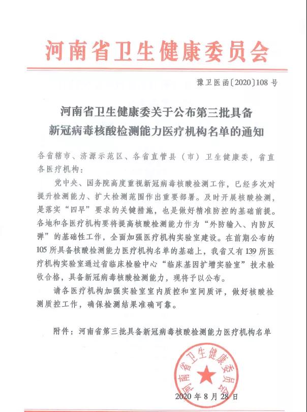 近日,鄲城縣婦幼保健院PCR核酸檢測實驗室通過了河南省臨床檢驗中心的室間質(zhì)量評價和實驗室二級生物安全備案,已具備新冠病毒核酸檢測能力,可承擔新冠病毒核酸檢測工作。目前,各高校正在陸續(xù)開學,但新冠疫情仍未完全控制,按照疫情防控要求,報到學生需進行一次核酸檢測,持報告單入學報到。鄲城縣婦幼保健院作為河南省衛(wèi)生健康委員會批準的新冠核酸檢測機構(gòu),積極承擔社會責任,按照“應檢盡檢,愿檢盡檢”的原則,已經(jīng)于2020年9月1日起正式開展新冠病毒核酸檢測工作,希望廣大學子及有檢測需要的人員,本著對自己負責、對家庭負責、對社會負責的原則,積極檢測,為疫情防控工作貢獻力量。