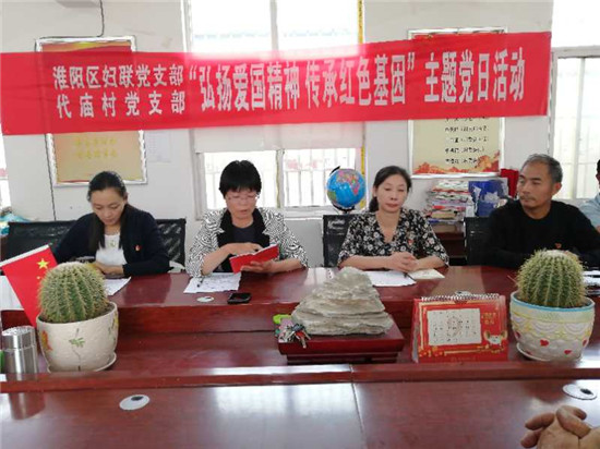為進(jìn)一步教育引導(dǎo)黨員、干部弘揚(yáng)愛國精神,傳承紅色基因,夯實(shí)基層黨支部戰(zhàn)斗堡壘和黨員先鋒模范作用。9月22日(農(nóng)歷初六),淮陽區(qū)婦聯(lián)黨支部在幫扶村大連鄉(xiāng)代廟行政村,與該村黨支部共同開展“弘揚(yáng)愛國精神 傳承紅色基因”9月份主題黨日活動。區(qū)婦聯(lián)全體黨員、代廟村黨支部在家黨員參加了活動。