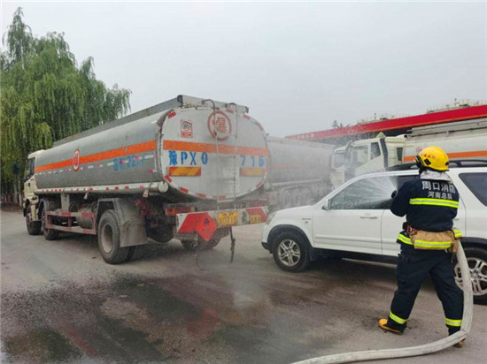 當(dāng)日上午10時(shí),商水交警大隊(duì)指揮中心接到報(bào)警:在商水縣興商大道與陳勝大道交叉口西、湯莊油庫(kù)處,一輛轎車(chē)與一輛?;饭捃?chē)追尾相撞,正常罐體損壞,?;沸孤镀鸹穑I車(chē)駕駛室變形,駕駛?cè)吮焕к?chē)內(nèi),如不及時(shí)救援,駕駛?cè)擞猩kU(xiǎn),另外因事故現(xiàn)場(chǎng)臨近湯莊油庫(kù),如不及時(shí)處置可能發(fā)生爆炸,后果不堪設(shè)想。