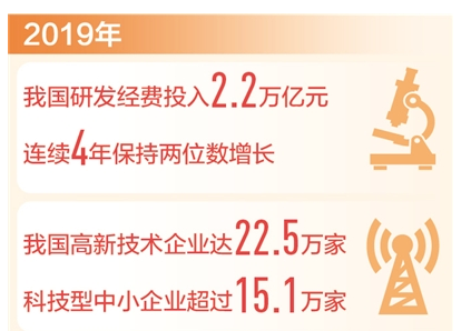 科技創(chuàng)新助推高質(zhì)量發(fā)展,我國(guó)創(chuàng)新型經(jīng)濟(jì)格局初步形成。截至2019年,全國(guó)高新技術(shù)企業(yè)達(dá)到22.5萬家,科技型中小企業(yè)超過15.1萬家。作為培育高新技術(shù)產(chǎn)業(yè)的重要載體,高新區(qū)5年來量質(zhì)同步提升。2019年,169家國(guó)家高新區(qū)生產(chǎn)總值達(dá)12萬億元,經(jīng)濟(jì)總量占全國(guó)的1/10以上。