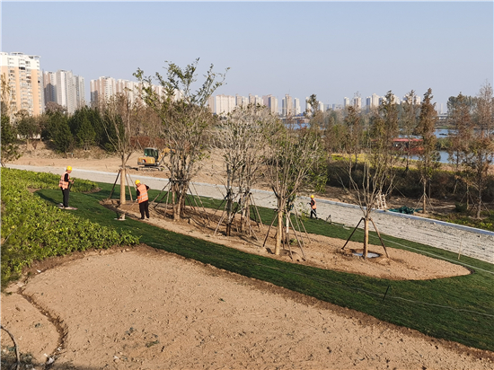 11月11日,在中心城區(qū)沙潁河北岸周口大道至八一大道段生態(tài)改造工程EPC項目施工現(xiàn)場,施工人員正在進(jìn)行地被植物的種植、綠化樹木的養(yǎng)護(hù)。