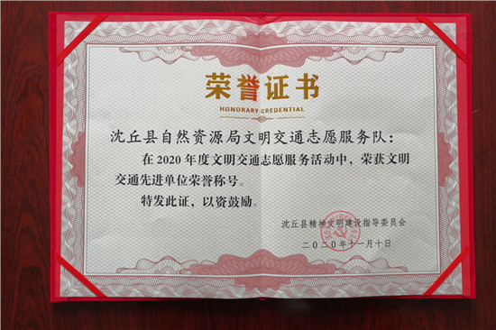 為大力弘揚(yáng)“奉獻(xiàn)、友愛、互動、進(jìn)步”的志愿服務(wù)精神,樹立典型、激勵先進(jìn),近日,沈丘縣精神文明建設(shè)指導(dǎo)委員會對2020年度文明交通志愿服務(wù)活動情況進(jìn)行通報(bào)表彰,全縣25家部門單位文明交通志愿服務(wù)隊(duì)、101名文明交通優(yōu)秀志愿者受表彰,沈丘縣自然資源局名列其中。
