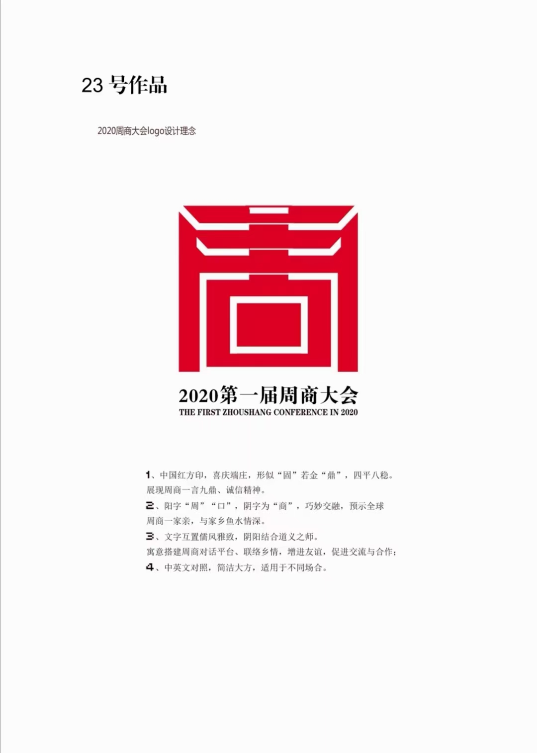 23號作品設(shè)計(jì)者沈湛向記者介紹了獲獎作品的設(shè)計(jì)理念。作品采用中國紅,喜慶端莊,智圓行方,形似“固”若金“鼎”,四平八穩(wěn),展現(xiàn)了周商的志存高遠(yuǎn)、一言九鼎和誠信經(jīng)營。同時(shí),陽字“周”“口”,陰字為“商”,巧妙交融,預(yù)示全球周商一家親,周商和家鄉(xiāng)魚水情深。再者,文字互置儒風(fēng)雅致,陰陽結(jié)合道義之師,寓意搭建周商對話平臺,聯(lián)絡(luò)鄉(xiāng)情、增進(jìn)友誼,促進(jìn)交流與合作。最后,中英文對照,簡潔大方,適用于不同場合。