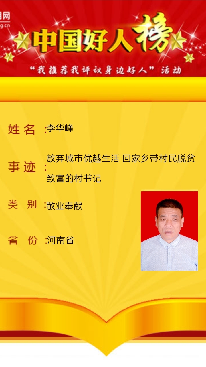 昨日,記者從市文明辦獲悉,今年46歲現(xiàn)任太康縣轉(zhuǎn)樓鎮(zhèn)李報(bào)真行政村黨支部書記的李華峰,放棄城市優(yōu)越生活,回鄉(xiāng)帶領(lǐng)村民致富,榮登2020年10月份“敬業(yè)奉獻(xiàn)”類“中國(guó)好人榜”。至此太康縣中國(guó)好人達(dá)到67人。