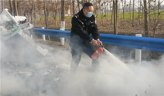 當(dāng)日下午4點(diǎn)左右,太康縣交警大隊(duì)二中隊(duì)指導(dǎo)員南應(yīng)開及輔警郭旗全、魯?shù)?、尹晨豪正在趙堂村附近巡邏時(shí),猛然看到前方一輛電動(dòng)三輪車上有煙氣冒出,巡邏民警加速趕到。原來(lái)是一名老漢的一輛拉著廢舊紙箱的電動(dòng)三輪車著了火,一車廢紙和塑料瓶散落一地正在燃燒,火越燒越旺,只見(jiàn)老漢正在手忙腳亂地滅火。這輛三輪車上拉的全是廢塑料、硬紙殼等易燃物,而且當(dāng)時(shí)正刮著風(fēng),如果不及時(shí)滅火任由火勢(shì)蔓延,后果將不堪設(shè)想??吹酱饲闆r后,南應(yīng)開迅速?gòu)木嚿夏贸鰷缁鹌髅胱儭跋绬T”,對(duì)著起火的物品進(jìn)行滅火操作,同時(shí)安排輔警對(duì)過(guò)往行人和車輛進(jìn)行疏導(dǎo)。由于發(fā)現(xiàn)和撲救及時(shí),在民警的緊急救援下,火源很快被眾人合力撲滅。對(duì)太康交警面對(duì)火情臨危不亂、果斷處置、幫助群眾的行為,老漢車主和過(guò)往群眾紛紛點(diǎn)贊。②6