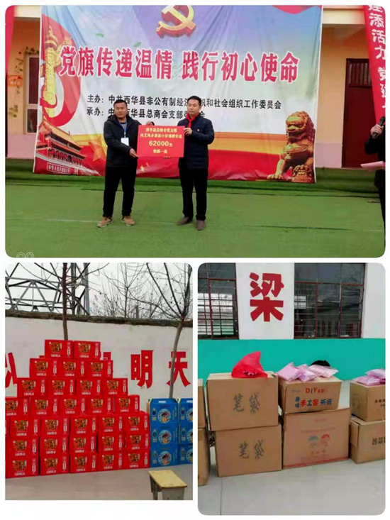 12月22日,西華縣“兩新”組織黨工委聯(lián)合縣總商會(huì)黨支部,在艾崗鄉(xiāng)潘南小學(xué)開展“黨旗傳遞溫情、踐行初心使命”愛心捐助活動(dòng),潘南小學(xué)全體師生及愛心企業(yè)家共計(jì)200余人參加活動(dòng)。