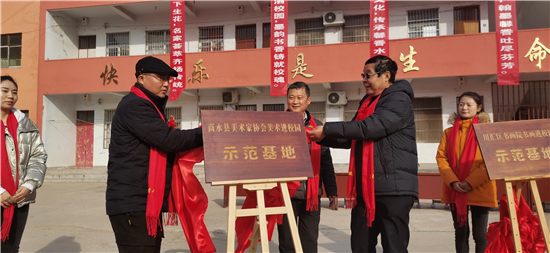 與會(huì)領(lǐng)導(dǎo)分別為“川匯區(qū)書(shū)畫(huà)院書(shū)法進(jìn)校園示范基地”“商水縣書(shū)法家協(xié)會(huì)書(shū)法進(jìn)校園示范基地”“商水縣美術(shù)家協(xié)會(huì)美術(shù)進(jìn)校園示范基地”揭牌。中國(guó)書(shū)法家協(xié)會(huì)會(huì)員、中國(guó)作家協(xié)會(huì)會(huì)員、周口師范學(xué)院特聘教授張華中,周口市書(shū)法家協(xié)會(huì)副秘書(shū)長(zhǎng)、川匯區(qū)文聯(lián)副主席游富華,以及我縣原政協(xié)副主席、商水縣美術(shù)家協(xié)會(huì)主席司新國(guó),河南省書(shū)法家協(xié)會(huì)會(huì)員、文聯(lián)主席劉秋玲,中國(guó)書(shū)法家協(xié)會(huì)會(huì)員、商水縣書(shū)協(xié)主席趙世貴 ,中國(guó)美術(shù)家協(xié)會(huì)會(huì)員郭保同,河南省書(shū)法家協(xié)會(huì)會(huì)員關(guān)保證、王艷飛、沈曉虹,河南省美術(shù)家協(xié)會(huì)會(huì)員李飛等市縣知名書(shū)畫(huà)家向?qū)W校捐贈(zèng)了墨寶。