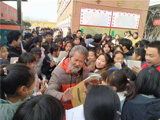 書(shū)畫(huà)家們的到來(lái),受到學(xué)子們的歡迎,千名學(xué)生將書(shū)畫(huà)家們團(tuán)團(tuán)圍住,像追星一樣,討教書(shū)法藝術(shù)。書(shū)畫(huà)家門(mén)興致盎然,揮毫潑墨,留下 “上善若水”“業(yè)精于勤”、及花鳥(niǎo)圖、山水畫(huà)等作品100余幅,并與師生現(xiàn)場(chǎng)互動(dòng)、傳經(jīng)送道、指點(diǎn)學(xué)生書(shū)法作品的得失。