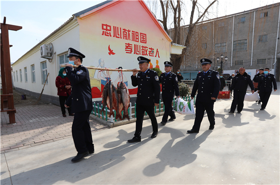 隨著春節(jié)日益臨近,該派出所所長(zhǎng)楊杰和大家商議,“送溫暖送祝?!被顒?dòng),應(yīng)該先從尊老愛(ài)幼開(kāi)始。于是,民警們購(gòu)買了60斤魚、100斤雞蛋和2袋面粉,利用中午休息時(shí)間來(lái)到敬老院,給老人們送上新春祝福。