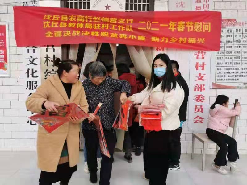 村室外邊,縣教體局駐村工作隊長李小兵、村干部不停地把一幅幅火紅的春聯(lián)遞到村民的手上,并和大家互道祝福:“鄉(xiāng)親們,新年好,牛年好運?!?/p>