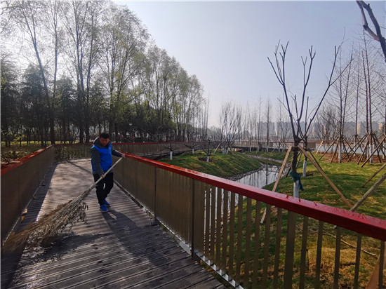 3月9日,魚翔湖曲廊環(huán)繞、新樹挺立,水面波光粼粼,不少市民漫步其中感受這水清岸綠 魚翔淺底的美景。