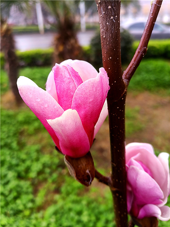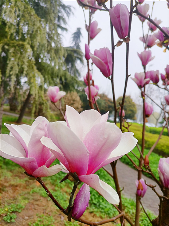 “霓裳片片晚妝新,束素亭亭玉殿春。已向丹霞生淺暈,故將清露作芳塵?!?月11日,我市下了一場小雨,路旁的紫玉蘭更顯晶瑩玉潤,朵朵玉蘭花如雨后新荷般清麗脫俗,或含苞待放、欲語還休,或花瓣盡展、舞姿翩翩,令人不禁駐足欣賞。