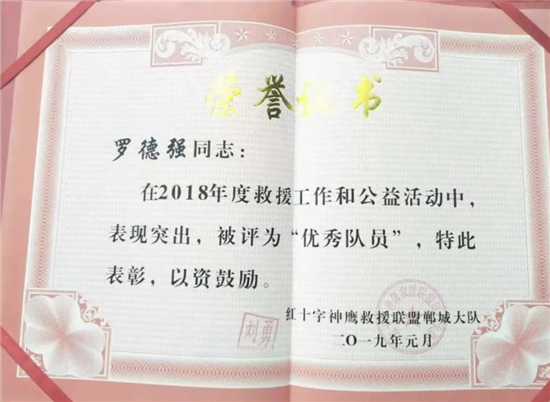 鄲城縣神鷹救援隊(duì)隊(duì)長劉勇說,正是看到了羅德強(qiáng)的優(yōu)秀品質(zhì),2018年將羅德強(qiáng)吸納為神鷹救援隊(duì)員?!吧聱椌仍?lián)盟鄲城大隊(duì)隸屬于中國神鷹救援隊(duì),由各個(gè)行業(yè)的志愿者組成,也是河南省成立最早的一支民間救援隊(duì),除參加全國各地災(zāi)后救援活動(dòng)外,日常積極參加社會(huì)志愿者活動(dòng)?!薄拔乙粋€(gè)人的力量很有限,加入這個(gè)優(yōu)秀集體,能夠?qū)W到更多專業(yè)救援知識(shí),從而幫助更多的人,我感到非常驕傲和自豪。”羅德強(qiáng)說。2019年8月10日,受第九號(hào)臺(tái)風(fēng)“利奇馬”影響,山東省壽光市、東營市等部分地區(qū)遭受洪災(zāi)。8月11日晚上,紅十字神鷹救援聯(lián)盟鄲城大隊(duì)趕赴山東壽光救災(zāi)。面對(duì)洪災(zāi),羅德強(qiáng)和其他救援隊(duì)員不畏辛苦,劃船深入各個(gè)受災(zāi)鄉(xiāng)村救助被困群眾。壽光市一鄉(xiāng)鎮(zhèn)3處大閘因斷電出現(xiàn)險(xiǎn)情,需要人力進(jìn)行開閘泄洪。羅德強(qiáng)和隊(duì)員冒險(xiǎn)攀爬到大閘上進(jìn)行人工作業(yè),經(jīng)過3個(gè)多小時(shí)的奮戰(zhàn),3處大閘全部打開,安全泄洪。2019年9月1日,參加泳渡日月潭返程途中,羅德強(qiáng)在福建高速公路上,發(fā)現(xiàn)前方車輛發(fā)生車禍,一名司機(jī)腿部骨折、血流不止。他立即下車和司機(jī)溝通,一邊報(bào)警,一邊利用專業(yè)救援知識(shí)打開變形的車門,順利將司機(jī)救出?!坝捎谶^度驚嚇,司機(jī)以骨折為由拒絕下車。當(dāng)我告訴司機(jī)自己是神鷹救援隊(duì)員、救援技術(shù)過硬后,才同意我們施救。”當(dāng)時(shí)高速上車流密集,情況十分危險(xiǎn),如果司機(jī)不能及時(shí)救出,后果不堪設(shè)想。“我們車輛加油、住宿、吃飯等救援費(fèi)用都是隊(duì)員AA制負(fù)擔(dān),從來不給當(dāng)?shù)卣蚓戎颂砣魏温闊?。?/p>
