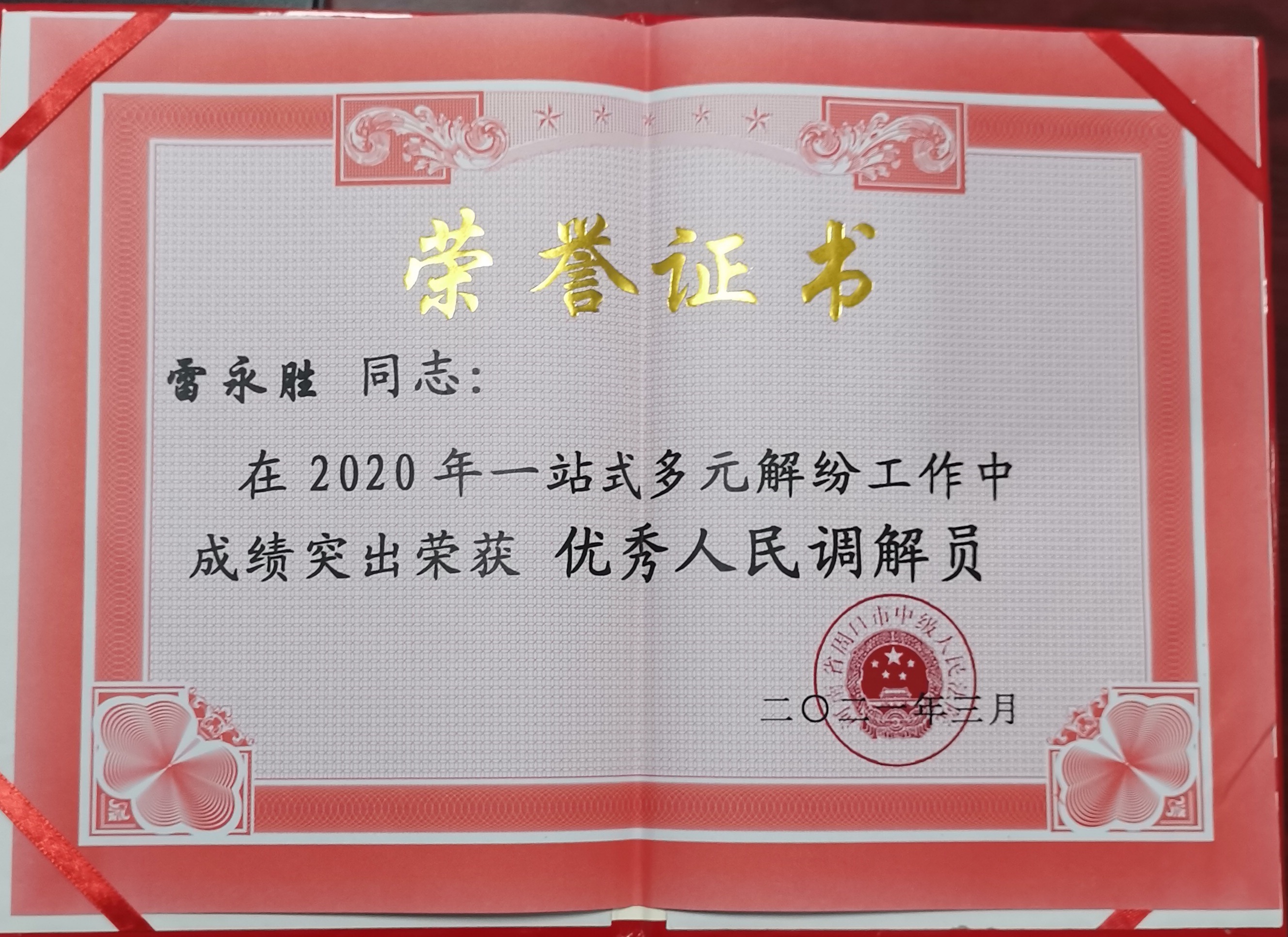自2020年5月以來,雷永勝調(diào)解員已累計(jì)接受各類案件近200件,成功調(diào)解近百件,助力法院訴前調(diào)解工作邁入先進(jìn)行列,化解了大量社會矛盾,為維護(hù)社會和諧穩(wěn)定作出了積極貢獻(xiàn)。日前,雷永勝被周口市中級法院評為“2020年度優(yōu)秀人民調(diào)解員”。