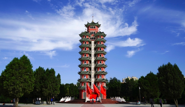 在甘肅省白銀市會寧縣紅軍會寧會師舊址內(nèi),有一座高33.33米,呈三塔環(huán)抱雄姿的紀念塔——中國工農(nóng)紅軍第一二四方面軍會師紀念塔。