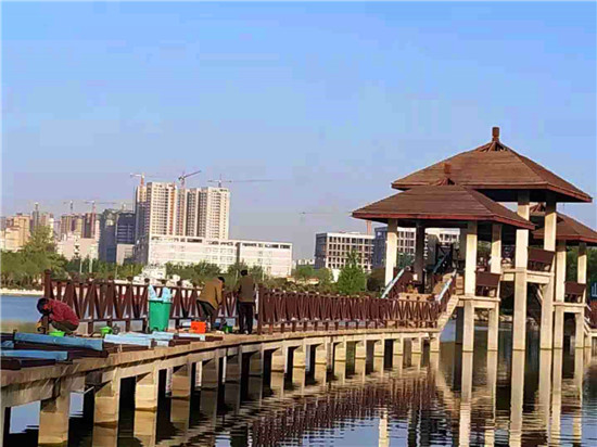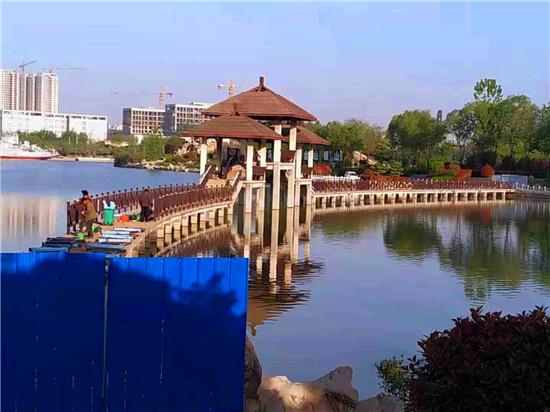近日,位于文昌大道的周口公園啟動了對水上棧道的維修。周口公園的水上棧道和亭榭是一道美麗的風(fēng)景,成為人們游園打卡之地,然而因建造時用的是木材,歷經(jīng)風(fēng)雨,朽壞嚴(yán)重,存在安全隱患,周口公園方面于去年將之封閉。記者在現(xiàn)場看到,工人已經(jīng)將木質(zhì)扶欄、道上木板拆除,正在安裝鐵護欄。鐵護欄油漆成棕褐色,依然保持原棧道的風(fēng)格和色調(diào)。②7