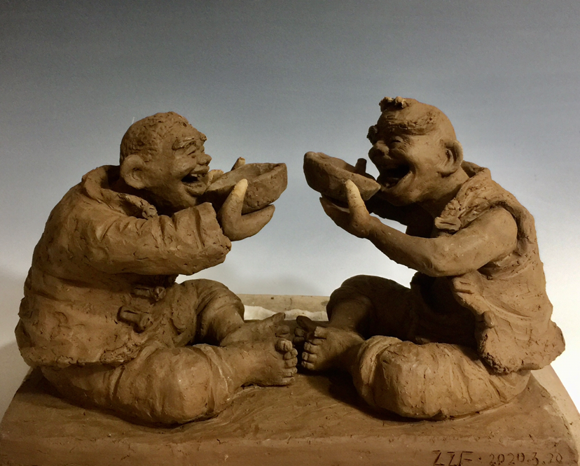 隨后,張振福又介紹了近期創(chuàng)作的慶祝中國共產(chǎn)黨成立100周年紅色主題泥塑《征途漫漫》《長在黨旗下》《淮海戰(zhàn)役》《一個蘋果的故事》等。李尚武贊賞張振福泥塑風格獨特、主題鮮明,傳遞了正能量,作品具有思想性、藝術性,充滿鄉(xiāng)情味、泥土味。