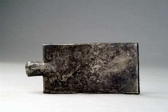 在周口市博物館展廳中,陳列著一件楚國(guó)實(shí)首方肩銀布幣,它呈長(zhǎng)方形鏟狀,長(zhǎng)13.6cm,寬6.2cm,短柄,實(shí)首,灰白色,保存完好,為國(guó)家一級(jí)文物。