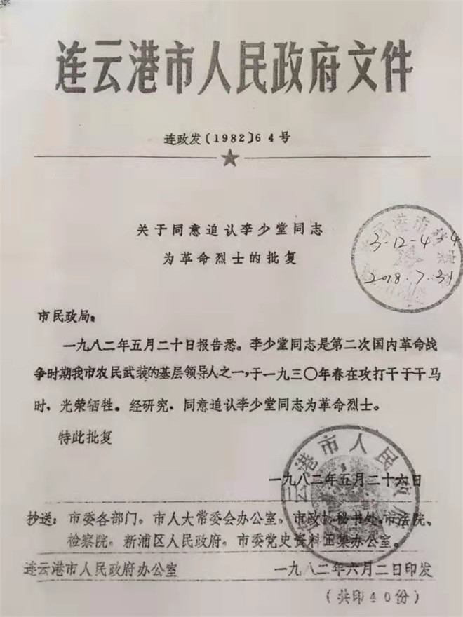 新中國成立后,李少堂的孫子才聯(lián)系上了李少堂曾經(jīng)的革命戰(zhàn)友惠浴宇同志。時(shí)任江蘇省省長的惠浴宇同志得知消息后,親寫證明遞交黨中央,這才證實(shí)了李少堂的身份。