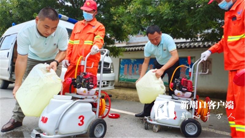 “老關(guān),你們?nèi)膫€(gè)人去女?huà)z景區(qū)消殺。老王,老溫你們兩個(gè)人去村莊消殺,尤其是旮旯處、垃圾堆、屋后等隱蔽重點(diǎn)區(qū)域一定消殺徹底,不留空白。在村莊內(nèi)進(jìn)行消殺時(shí),一定要和群眾交代好防疫消毒時(shí)的注意事項(xiàng)?!?月30日9時(shí)許,來(lái)自廣州市鴻鷹害蟲(chóng)防治服務(wù)有限公司周口分公司的10多名愛(ài)心人士載著4臺(tái)機(jī)動(dòng)手推式滯留噴霧機(jī)、1臺(tái)電動(dòng)背負(fù)式超低容量噴霧機(jī)、1臺(tái)大型車(chē)載式超低容量噴霧機(jī)和230公斤消毒劑,來(lái)到西華聶堆鎮(zhèn)思都崗村后,該公司負(fù)責(zé)人許金山就向工作人員一一分配消殺任務(wù)。