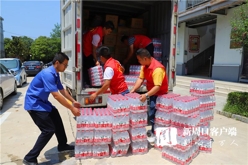 當(dāng)天中午,掛著印有“昨天大家助我脫貧,今天我為救災(zāi)出力!”條幅的防汛救災(zāi)物資運(yùn)輸車抵達(dá)周口港區(qū)?!耙皇乔皟商旆烙_(tái)風(fēng)‘煙花’,我們?cè)缇蛠?lái)了?!甭」糯妩h支部書記段長(zhǎng)春一下車就連忙慰問眾人。一同前往的還有6位年輕力壯的志愿者,他們不辭勞苦,和港區(qū)消防、城管人員一起頂著烈日,用了半個(gè)多小時(shí)將滿車物資搬運(yùn)到位。