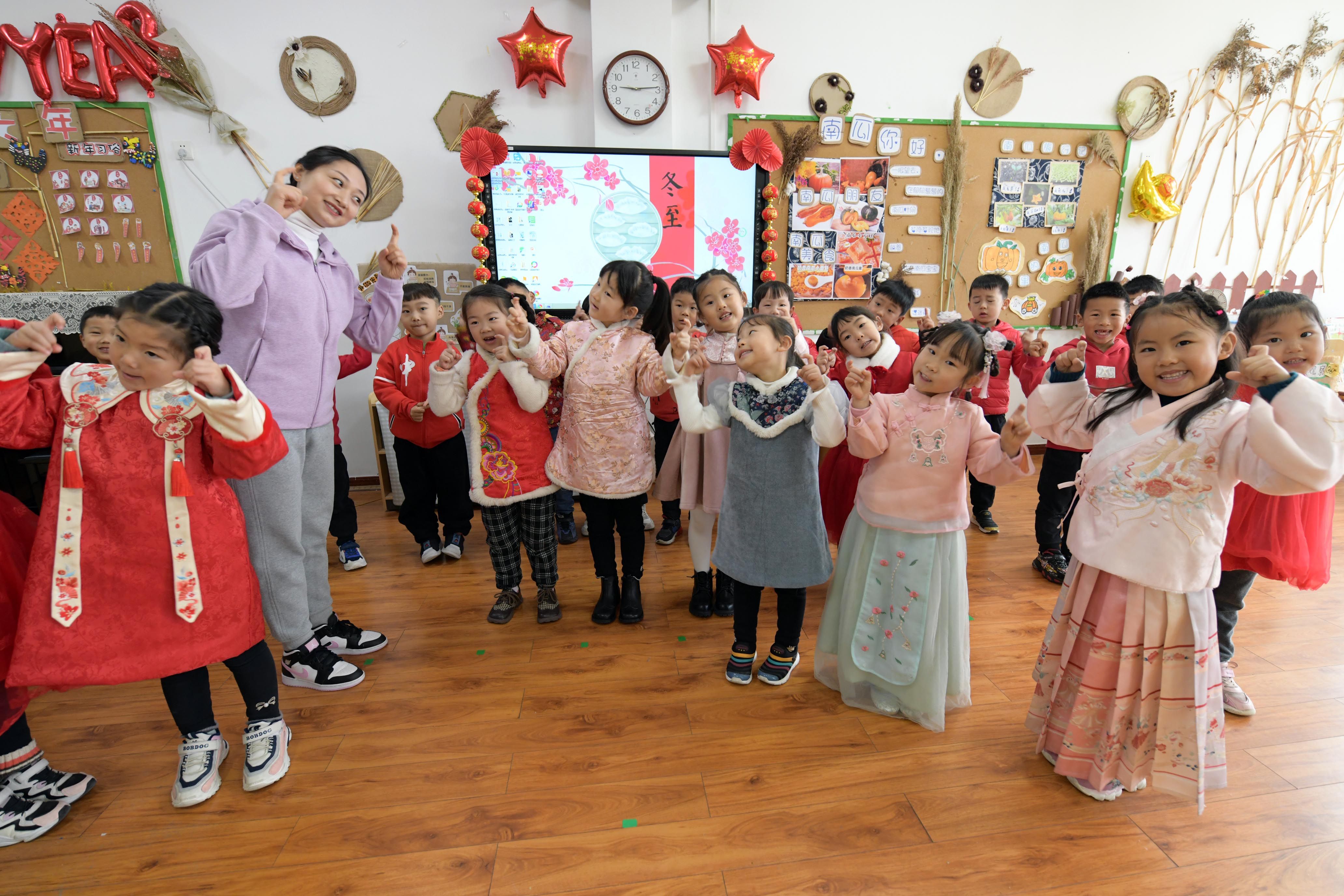 小朋友在老師的指導(dǎo)下學(xué)唱冬至數(shù)九歌。