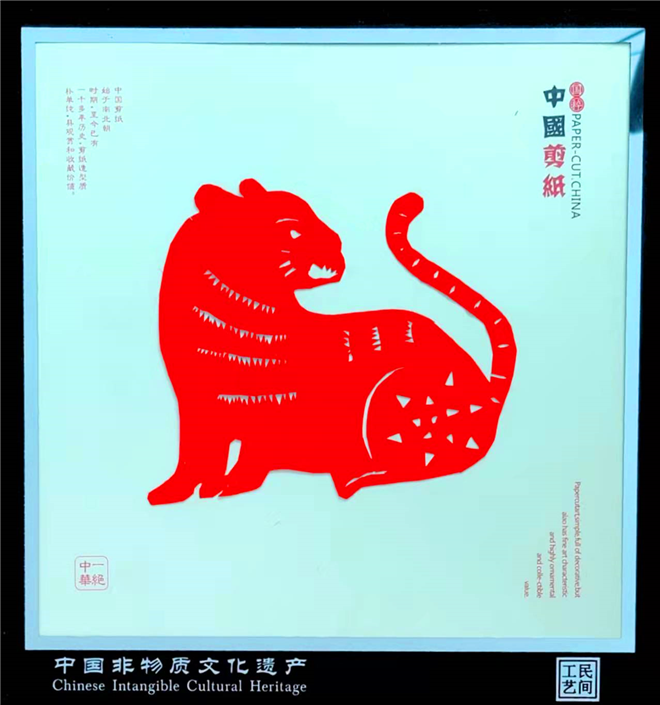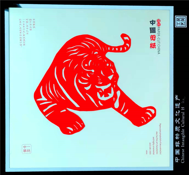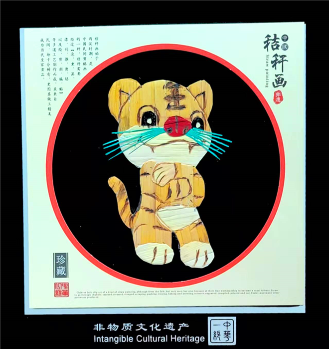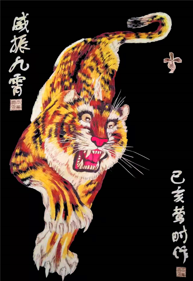為了慶?;⒛?,王春梅創(chuàng)作的秸稈畫主要有《威震九霄》《虎之王者》《飛天神虎》等,此外,她還創(chuàng)作了兩幅剪紙作品,分別是《虎年組圖》和《虎之2022》。和剪紙作品相比,秸稈畫制作工序更加復(fù)雜,全憑手工完成,充分利用秸稈本身的紋理和質(zhì)地,結(jié)合顏色、溫度的變化,將畫面立體的呈現(xiàn)出來(lái)。其中,她創(chuàng)作的部分作品結(jié)合了唐卡的相關(guān)風(fēng)格和顏色配比,比如《威震九霄》中虎的形象所表現(xiàn)出來(lái)的力量感借鑒了唐卡中護(hù)法的力量感;《虎之王者》和《虎之2022》中對(duì)于藍(lán)色的運(yùn)用結(jié)合了唐卡中的藍(lán)色,代表了永恒不變,如同穹蒼攬護(hù)萬(wàn)物之意。