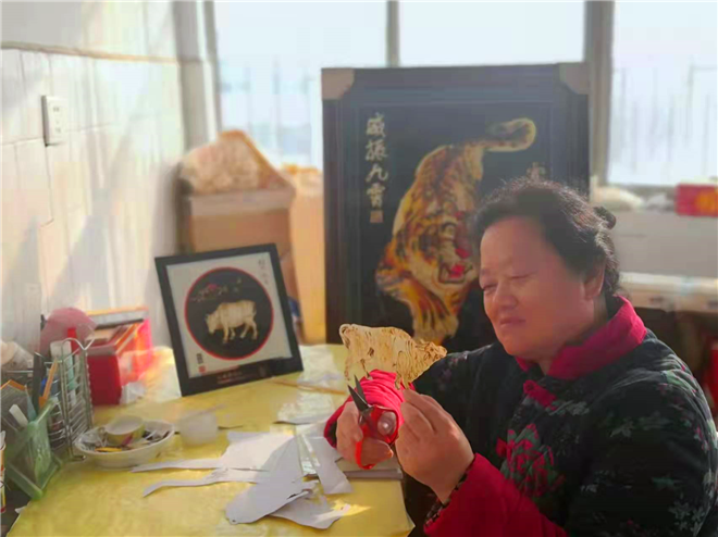“虎在中國(guó)是極其有力量的動(dòng)物?!?月25日,秸稈畫技藝代表性傳承人、中國(guó)民間文藝家協(xié)會(huì)國(guó)家級(jí)會(huì)員王春梅告訴記者,她耗時(shí)近半年創(chuàng)作的秸稈畫《威震九霄》已完成。記者看到,作品中的老虎長(zhǎng)半米有余,威風(fēng)凜凜、活靈活現(xiàn),用平面的方式展現(xiàn)了立體的效果?!?022年是虎年。在古代,老虎就以威風(fēng)凜凜的形象被視為勇氣的象征,來(lái)表現(xiàn)軍人的勇敢和堅(jiān)強(qiáng)。古時(shí)候關(guān)于將士大臣的美譽(yù)就有虎將、虎臣、虎士等?!蓖醮好氛f(shuō)。