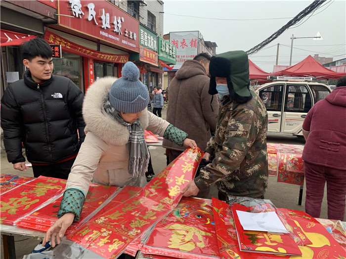 春節(jié)將至,不斷映入眼簾的喜慶“福”字映襯著摩肩接踵的人群。趕集時(shí),家家都要買幾張年畫、幾副春聯(lián),今年,以“虎”為主題的年畫春聯(lián)自然成了主角?!斑@個(gè)虎頭年畫今天已經(jīng)脫銷了,這個(gè)‘年年有余’的也喜慶?!睌傊魍醮蠼阋贿厧皖櫩吞裟戤嬕贿呅χf。年前,她早早囤好了近百種樣式的老虎年畫,現(xiàn)在看來還是不夠賣。除了過年必備的年畫春聯(lián),她還準(zhǔn)備了紅燈籠、紅燭等,也十分暢銷。