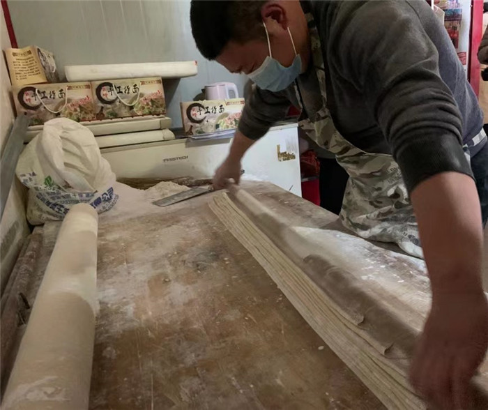 此時(shí),固墻鎮(zhèn)集市最低溫度為零攝氏度,40歲的王永強(qiáng)卻汗流浹背。他,正在自家面館里忙得熱火朝天。從14歲起,王永強(qiáng)就跟著表哥學(xué)習(xí)做手搟面,到現(xiàn)在已有26年的制作經(jīng)驗(yàn)?!斑^年這段時(shí)間一天搟10小時(shí)以上,能出個(gè)七八百碗,就這都賣不及。”王永強(qiáng)邊說邊做準(zhǔn)備工作,只見他將一盆醒好的、重40斤,用高筋面粉和鹽和好的面團(tuán)鋪在案板上,拿出一根一米五長的鐵棍將面團(tuán)按壓平整,再用有十幾年歷史的搟面杖,邊鋪撒玉米淀粉、邊用力搟。1個(gè)小時(shí)后,面團(tuán)被搟至薄皮狀,最后按層折疊鋪好,用快刀切成相等寬度,撣走多余面粉,挽成麻花狀。如此,遇水不散、出水不沾、溫潤光滑、筋而不膩的固墻手搟面就完成了。固墻手搟面最常見的做法是用大火多水煮沸后,撈起配以番茄雞蛋、蒜泥黃瓜,拌勻后享用。夾起一筷子面條,觀其形如玉帶臨風(fēng),察其色若飛雪粼粼,送入口中品其味,則似玉蘭入口,真是美哉!爽哉!