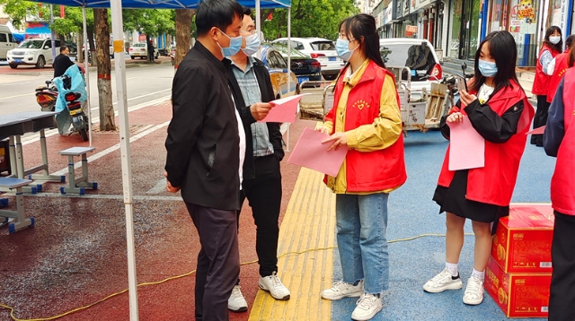 4月29日,商水團(tuán)縣委組織30余名志愿者向沿街商戶宣傳疫情防控政策,提醒沿街商鋪商家落實(shí)好掃“兩碼”、測體溫、出入登記等各項疫情防控措施。