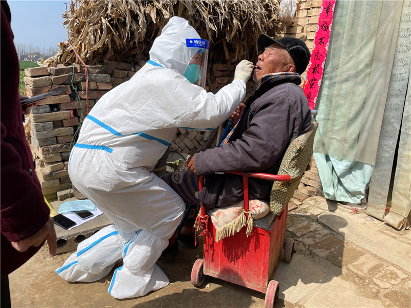 3月23日至4月13日,喬晶每天凌晨出發(fā),穿著密閉的防護(hù)服連續(xù)22天在太康馬廠工作。4月2日起,所有行政村實(shí)行入戶采集。從全民采樣到入戶采樣、封控人員實(shí)行一戶一管、重點(diǎn)管控人員一人一管、二十人混管到單管,加之村莊大、人員居住分散等,喬晶和她的同事面臨的是巨大挑戰(zhàn)!援太期間,每天都是30多攝氏度的高溫天氣,喬晶穿著密不透風(fēng)的防護(hù)服,戴著防護(hù)帽、防護(hù)面屏、口罩、手套,幾分鐘便汗如雨下。對此,她無怨無悔。