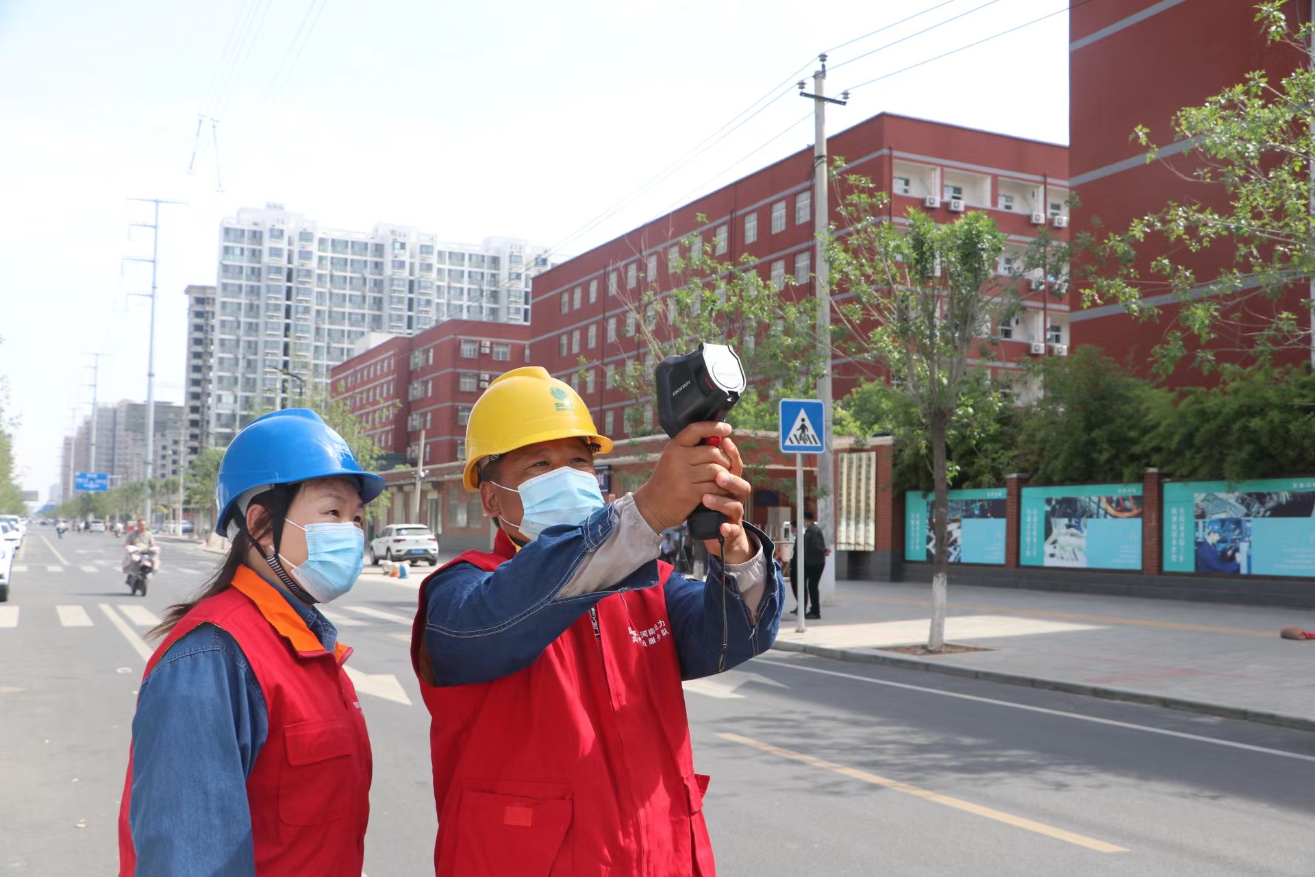 圖為焦裕祿共產(chǎn)黨員服務(wù)隊工作人員對考點周圍線路進行測溫