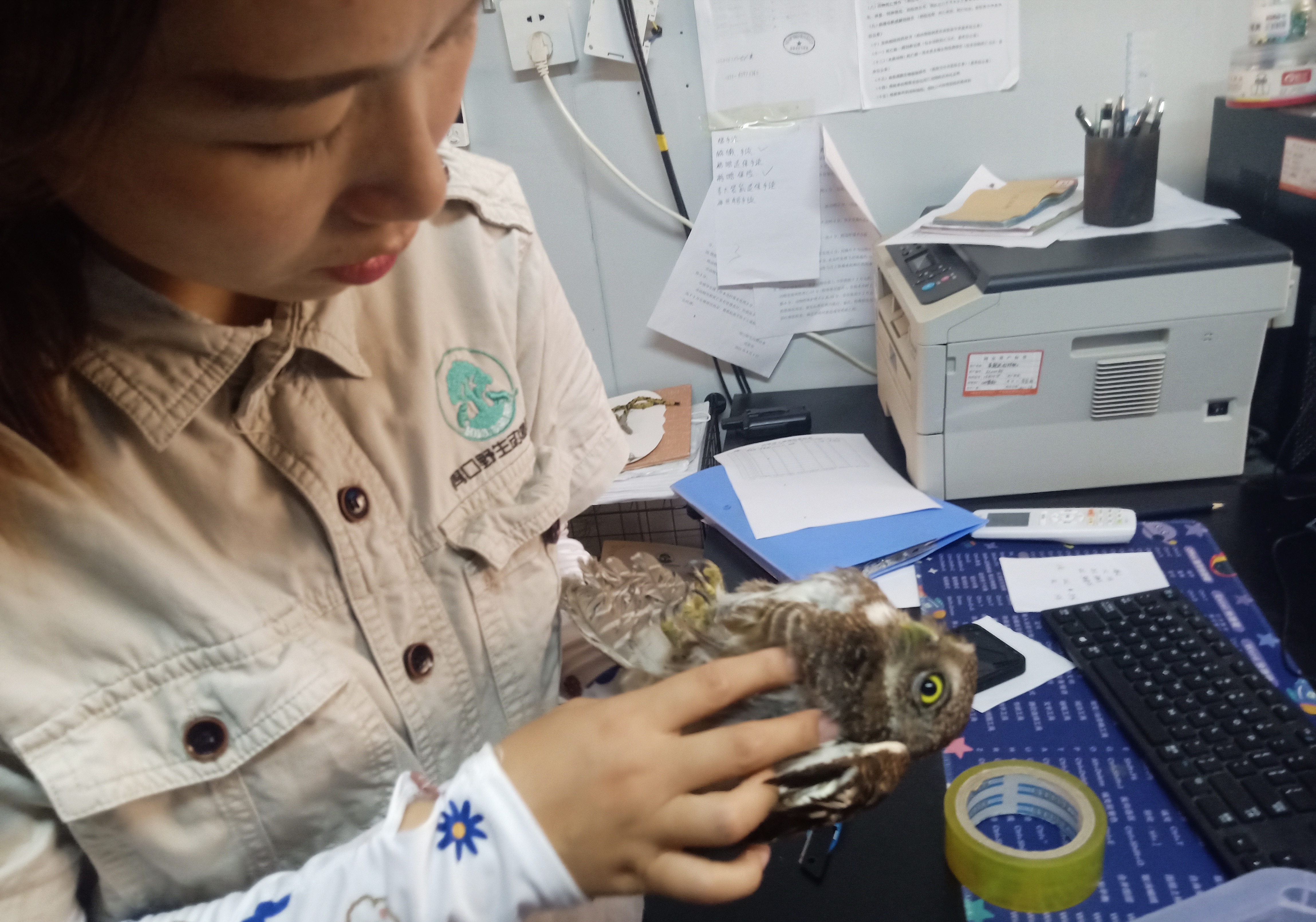 周口市野生動物救護中心專業(yè)人員楊露露對這只斑頭鵂鹠進行檢查傷情后說:“這只斑頭鵂鹠內傷嚴重,需要治療一段時間才能放歸大自然?!?/p>