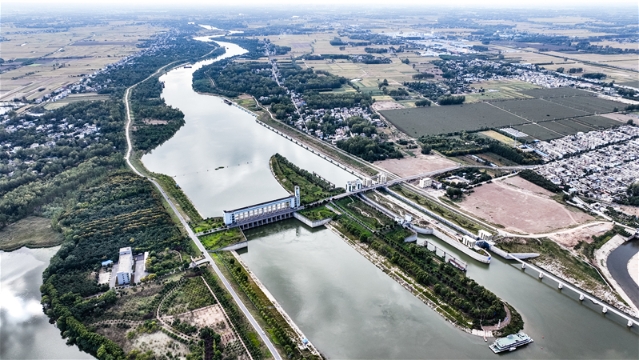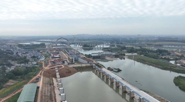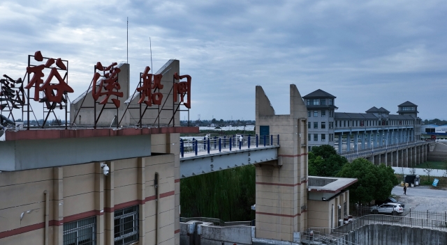 9月24日,豫貨出海、“周”向世界——周口航運(yùn)出海大型異地采訪活動(dòng)采訪組B組沿江淮運(yùn)河南下,一路上攬渡槽、臨派河、經(jīng)巢湖閘,再沿裕溪河左岸大堤下行,經(jīng)過(guò)一道河灣后,一座高大的建筑如臥龍一般橫跨裕溪河上。