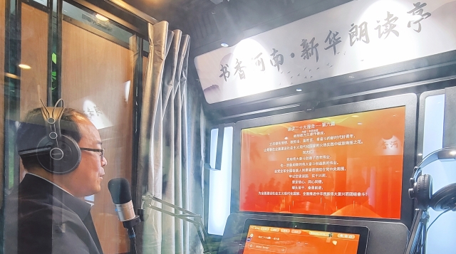 11月3日,在位于項(xiàng)城市商城路與西大街交叉口的新華書店朗讀亭內(nèi),誦讀愛(ài)好者年秋燕正在選讀黨的二十大報(bào)告原文,其深情且鏗鏘有力的誦讀聲令人如癡如醉。