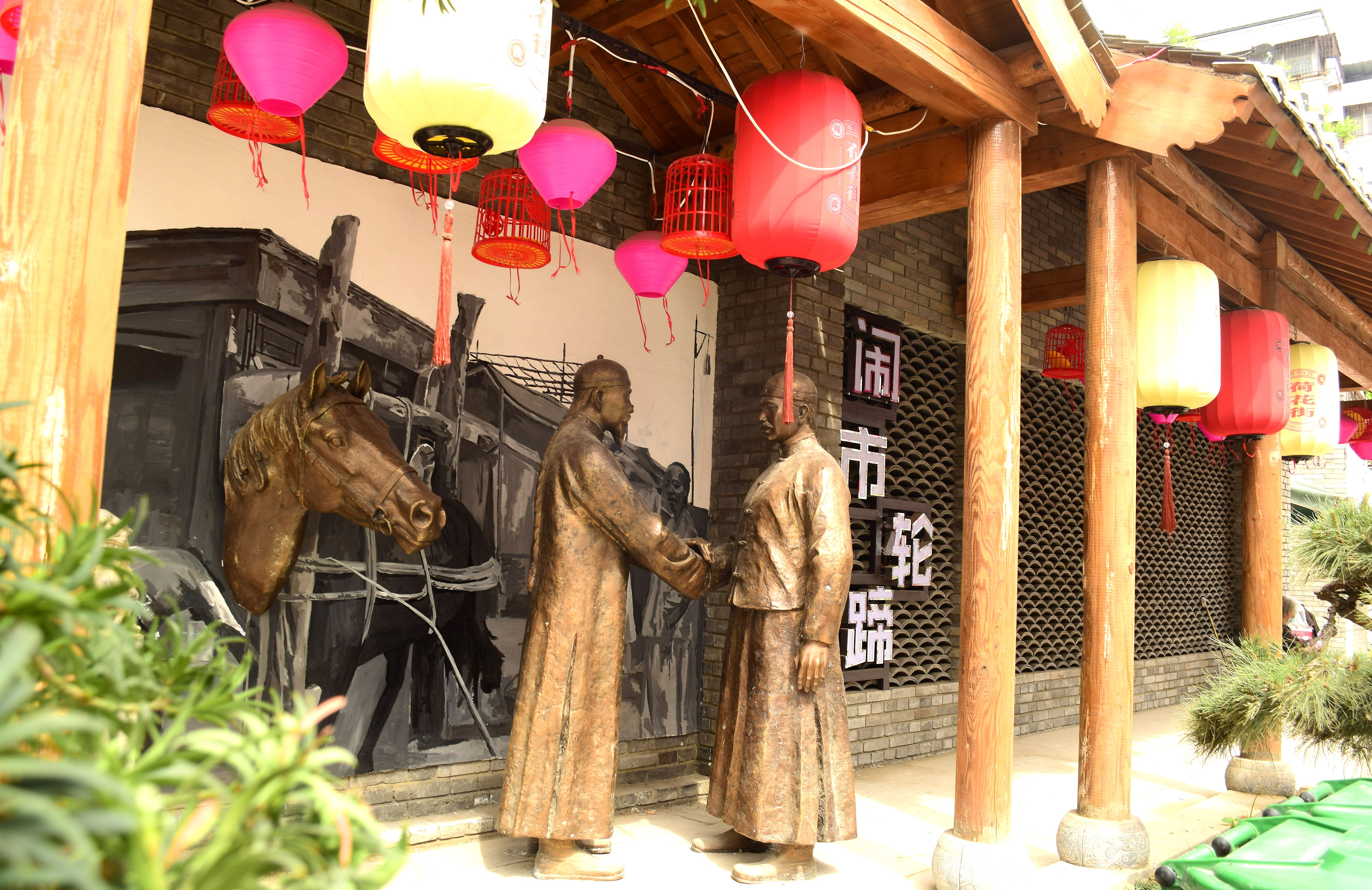 5月16日上午,記者在荷花街看到,其沿街仿古式游廊又增添了“鬧市輪蹄”雕塑,向人們再現(xiàn)了隱身到歷史深處的古街風情。