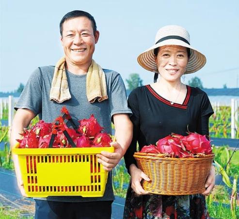 • 盛夏時節(jié),萬木蔥蘢。在太康縣清集鎮(zhèn)夢里田園火龍果種植基地,一株株仙人掌狀的火龍果成行排列,一個個飽滿的火龍果如火焰般垂掛枝頭。打扮利落的劉秀英邊用手機拍攝火龍果果皮上黃綠相間的鱗狀花萼,邊向粉絲介紹火龍果的長勢和收成情況。