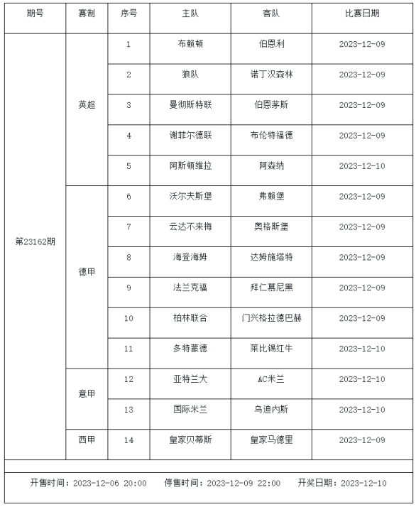 足球彩票勝負游戲(14場和任選9場)第23162期賽程: