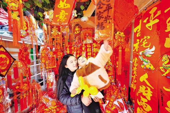 新春將至,年味漸濃。2月12日,在掛滿福字與春聯(lián)的商鋪里,市民懷抱著孩子認(rèn)真挑選,指尖拂過紅彤彤的春聯(lián)紙,目光里滿是對新年的期許。