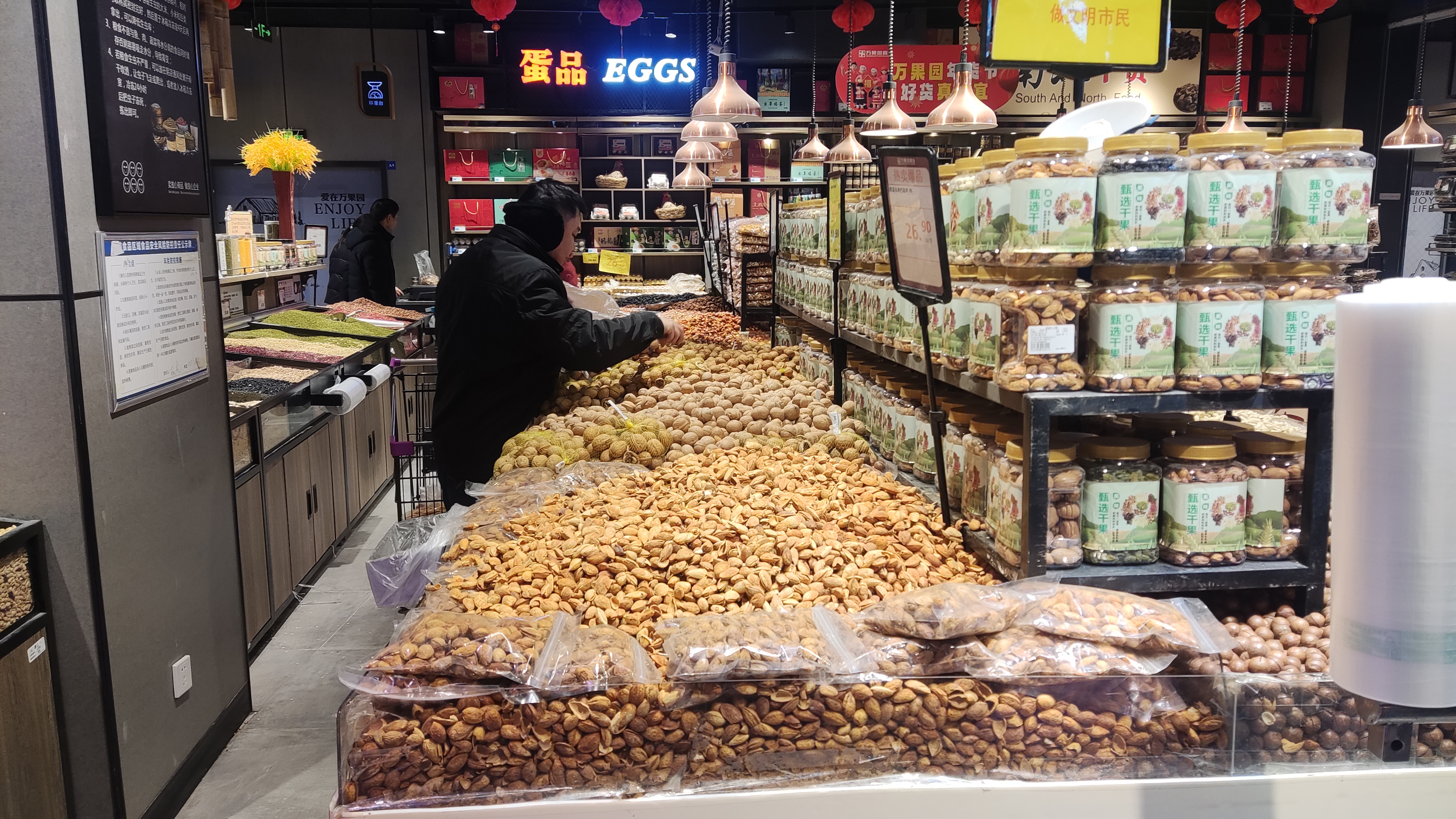 核桃、巴旦木、夏威夷果、碧根果……市民陳女士拎著一大包商品滿載而歸?!俺詧怨】涤逐B(yǎng)生,家里人都喜歡吃,過年期間一家人邊聊天邊吃堅果,滿滿年味?!标惻空f,組合裝小袋堅果比較劃算,里面有剝好的杏仁、核桃、腰果等,價格不貴,方便實惠。