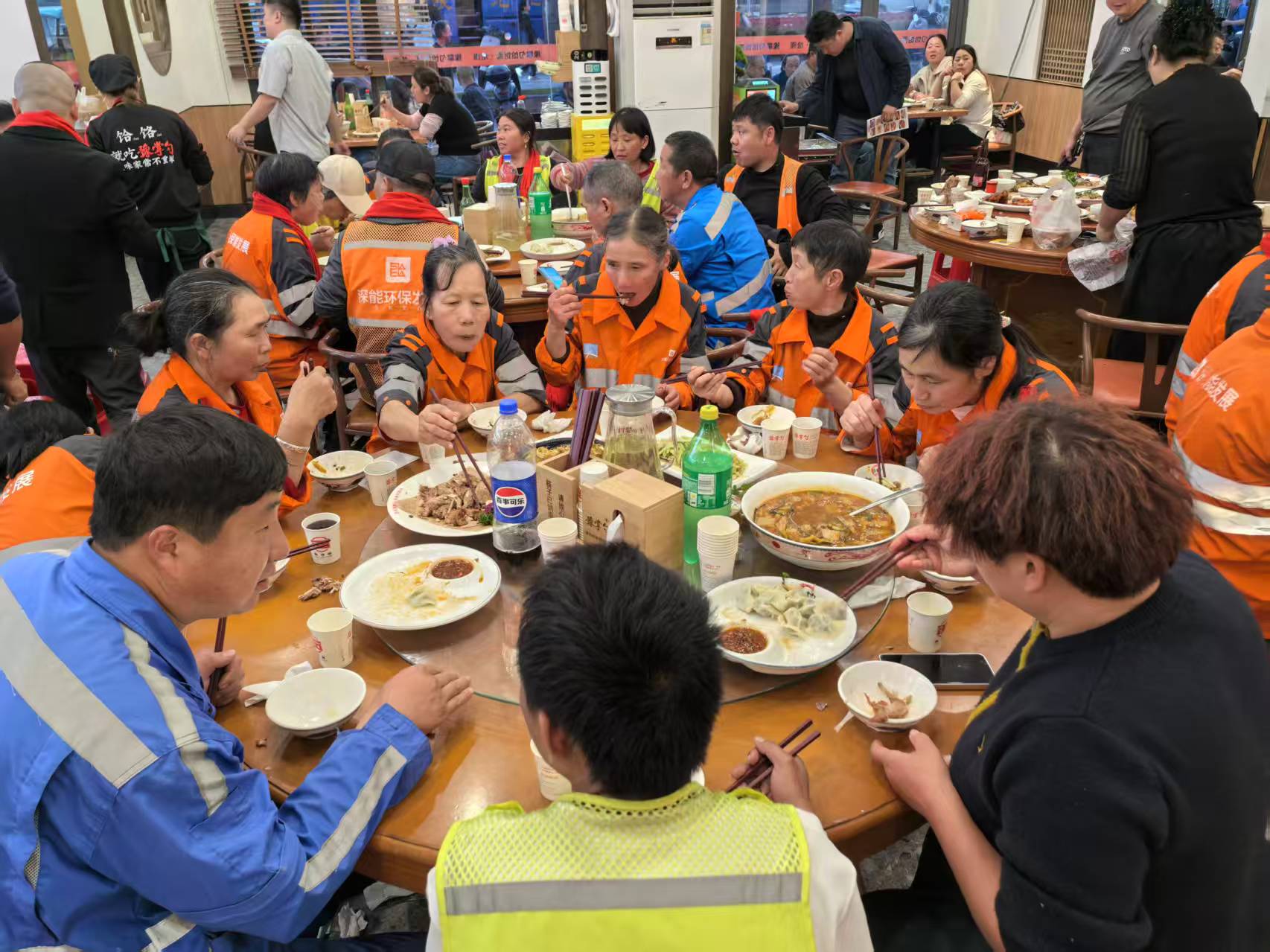 活動當(dāng)天,剛剛結(jié)束清掃工作的“城市美容師”們身穿工服陸續(xù)抵達(dá)。張高鵬早已在門口迎接,熱情問候每一位工人并送上新春祝福。席間,道口燒雞、五香牛蹄筋、酸菜魚等十多道佳肴相繼上桌,暖意融融的用餐氛圍中,歡聲笑語不斷,如家人般親切溫馨。