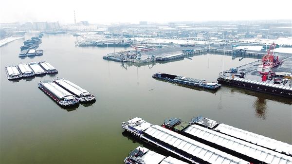 雪落沙潁河,潮涌新征程。1月1日,新年第一天,周口中心港范營(yíng)作業(yè)區(qū)碼頭上,工人有條不紊地裝卸著各類貨物。河面上,待泊的貨船排起長(zhǎng)隊(duì),船民們細(xì)心清理船上的積雪。另有滿載貨物的貨船鳴笛啟航,駛向遠(yuǎn)方。
