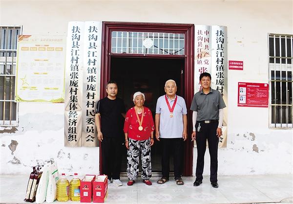 7月1日,扶溝縣委宣傳部駐江村鎮(zhèn)張龐行政村第一書記齊華中(左一)和村“兩委”干部走訪慰問(wèn)該村兩位黨齡超過(guò)50年的黨員,為他們送去黨組織的關(guān)懷與溫暖。據(jù)了解,90歲的張秀真(左二),1957年入黨。76歲的劉學(xué)明(左三),1970年入黨。