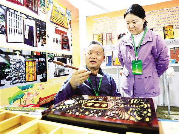 3月1日,在淮陽(yáng)伏羲文化廣場(chǎng)非遺展示大廳,省級(jí)非物質(zhì)文化遺產(chǎn)代表性項(xiàng)目汝陽(yáng)劉毛筆——御筆坊第67代制筆傳承人劉愛(ài)華(右)和父親劉好奎展示毛筆新品。