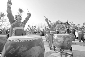 ▲2月24日,在山東煙臺毓璜頂廟會上,老年鑼鼓隊進行威風(fēng)鑼鼓表演。當(dāng)日,在山東煙臺毓璜頂廟會上,民間藝人們帶來了大秧歌、威風(fēng)鑼鼓、舞龍舞獅等民俗表演,為市民和游客獻上精彩紛呈的傳統(tǒng)文化大餐。新華社發(fā)
