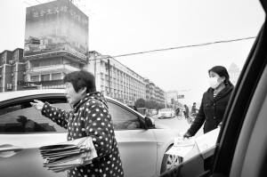 圖① 中心城區(qū)每個路口都存在不同程度的攔車散發(fā)傳單現(xiàn)象,既不文明又不安全。